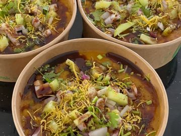 Deep fried lentil dumplings soaked in sseasoned yoghurt generously garnished with spices, housemade chutneys fresh coriander,& pomegranate arils(subject to availability)