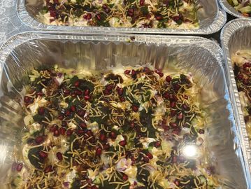 Indian street style nachos with crispy petite chicpea crackers , layered with spiced potato, sweet and savoury seasoned yoghurt , spices , tangy and savoury chutney sev/bhujia and pomegranate ariles (subject to seasonality. Pure vegetarian and makes a great party starter.